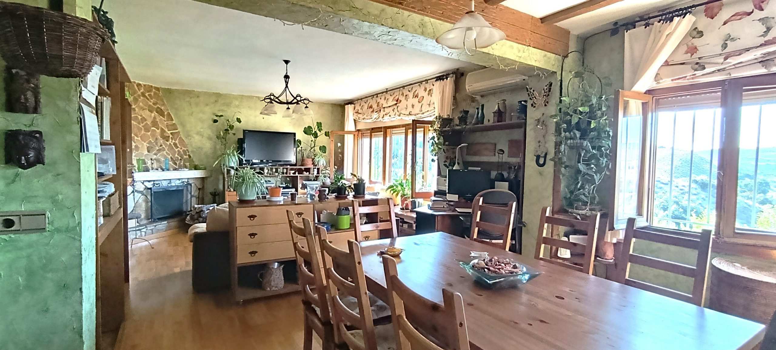 Planta Principal. – Gran salón-comedor de 35m2 con chimenea, muy acogedor y con unas vistas al pueblo inmejorables, es un placer sentarte en la mesa del comedor y mirar por sus grandes ventanales además de la luminosidad que tiene.
